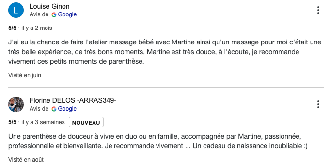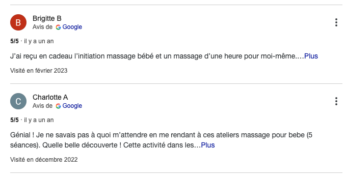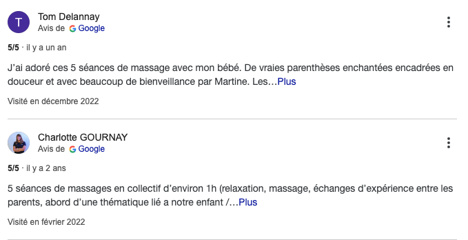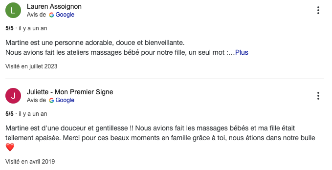 Je propose également des ateliers de massage pour parents et bébés. Dès l’âge d’un mois et jusqu’à environ dix mois, le massage permet de créer un moment privilégié entre le parent et son tout-petit. Les ateliers, répartis en cinq séances, permettent de renforcer le lien d’attachement tout en procurant apaisement et bien-être au bébé.